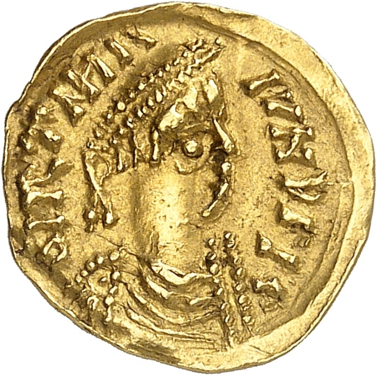 - FRANCE / MEROVINGIAN Burgondes. Trémissis dit à la boucle perdue, imitation de Justinien Ier ND (530-570).