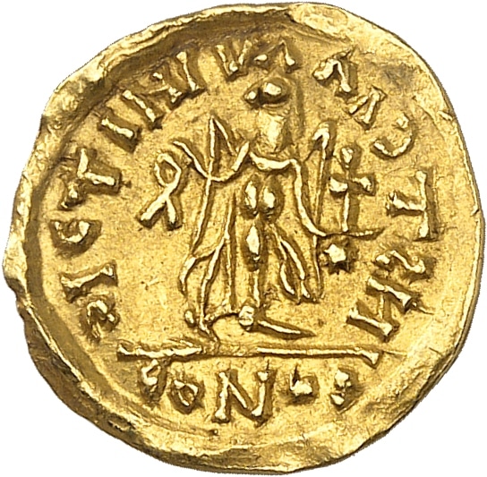 Rv. cIcTINIVA AACTSN / coNob. Victoire avançant à droite tenant une croix sur un globe de la main gauche et le bras droit en arrière vers une “boucle perdue”.