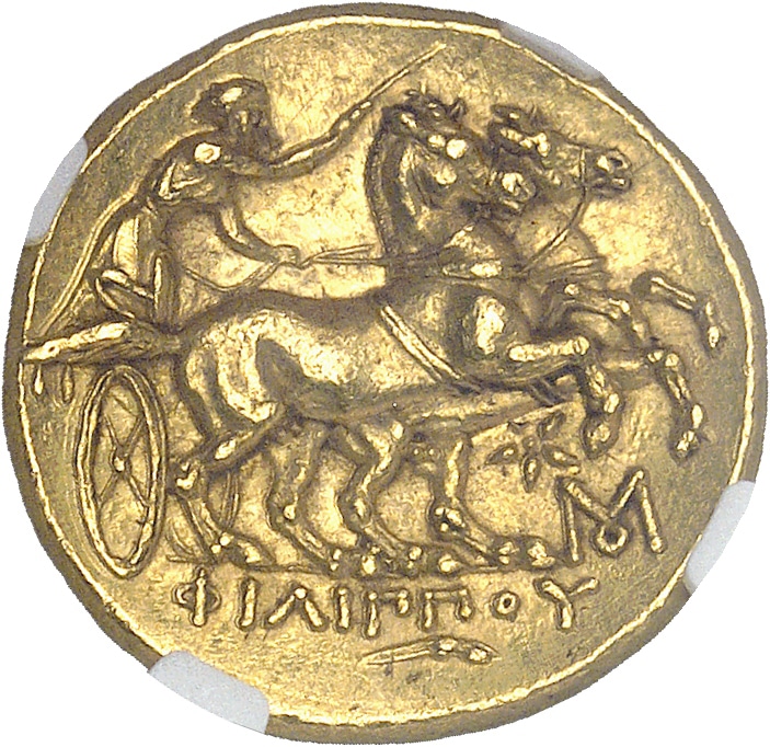 Rv. ΦΙΛΙΠΠΟΥ. Bige de chevaux au galop à droite, conduit par un aurige. Sous les chevaux, (différents) et patte de cheval à l’exergue.