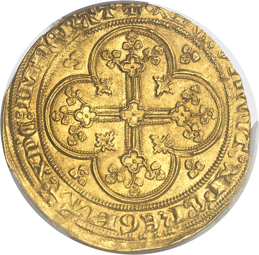 Rv. +° XP’C: VINCIT: XP’C: REGNAT: XP’C: IMPERAT. Croix quadrilobée et fleuronnée, dans un quadrilobe orné de feuilles et cantonné de quatre trèfles sans queue.