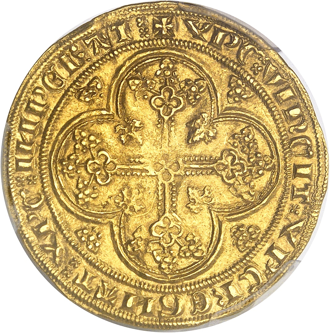 Av. + PHILIPPVS: DEI - xGRAx - FRANCORVM: REX (ponctuation par double sautoirs). Le Roi assis dans une stalle gothique, couronné, vêtu du haubert et de la cotte d’armes, tenant l’épée et l’écu de France aux lis sans nombre, dans un polylobe cantonné de petits trèfles ; sautoirs sur les marches de la stalle.