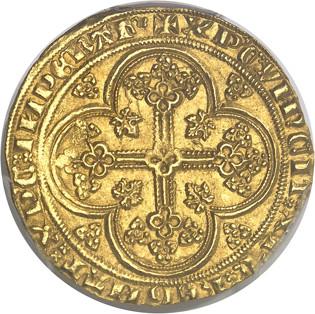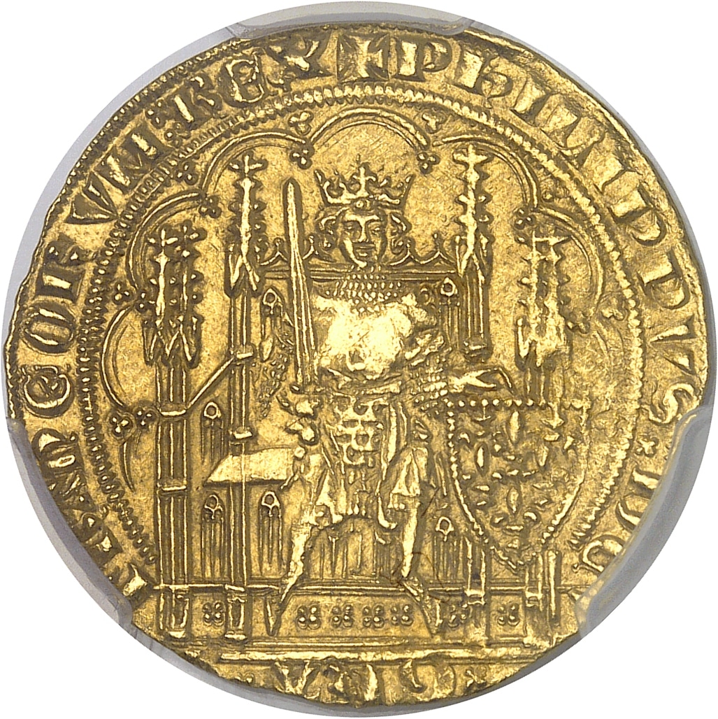 Av. + PHILIPPVS: DEI - xGRAx - FRANCORVM: REX (ponctuation par double sautoirs). Le Roi assis dans une stalle gothique, couronné, vêtu du haubert et de la cotte d’armes, tenant l’épée et l’écu de France aux lis sans nombre, dans un polylobe cantonné de petits trèfles ; sautoirs sur les marches de la stalle.