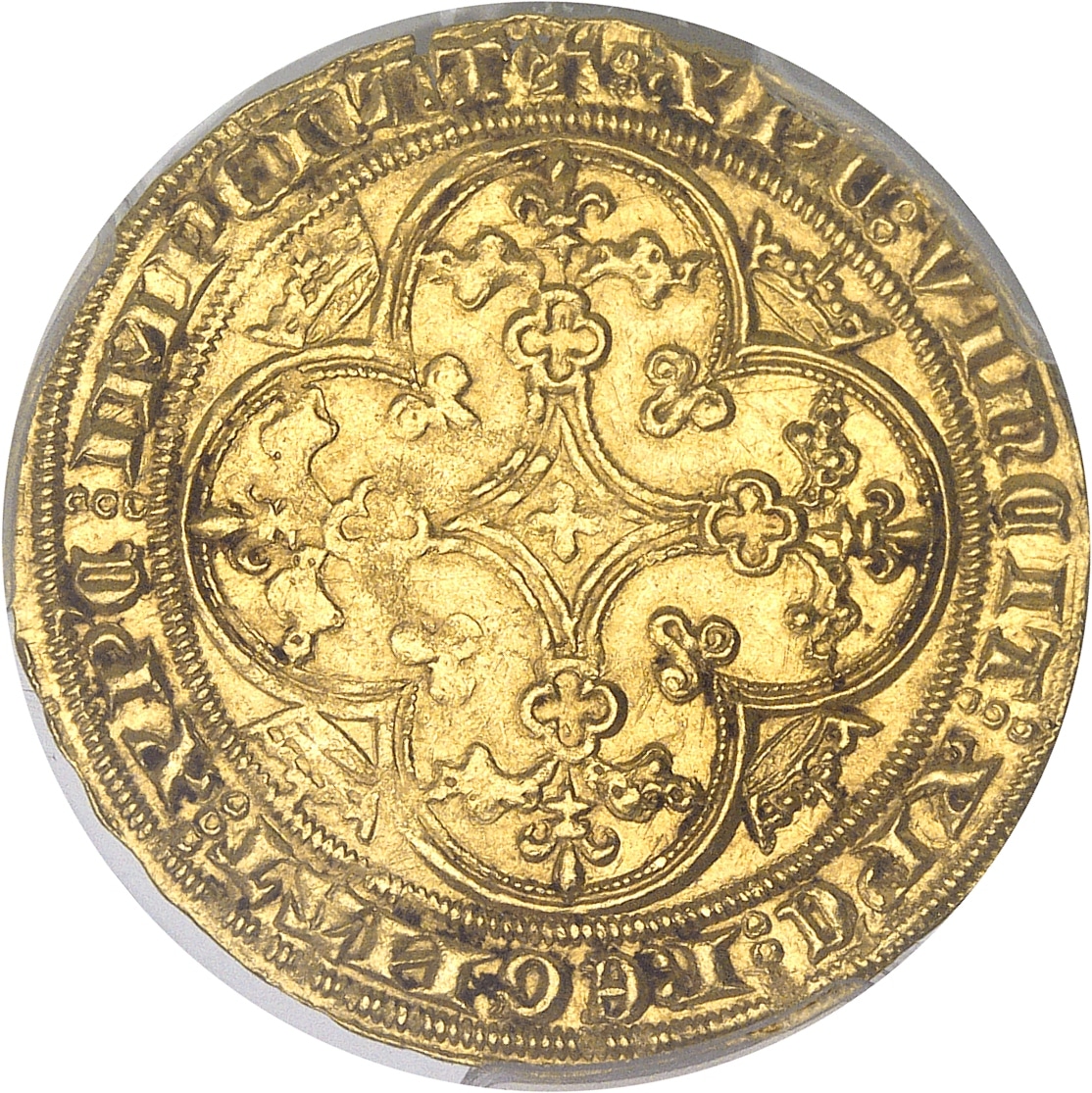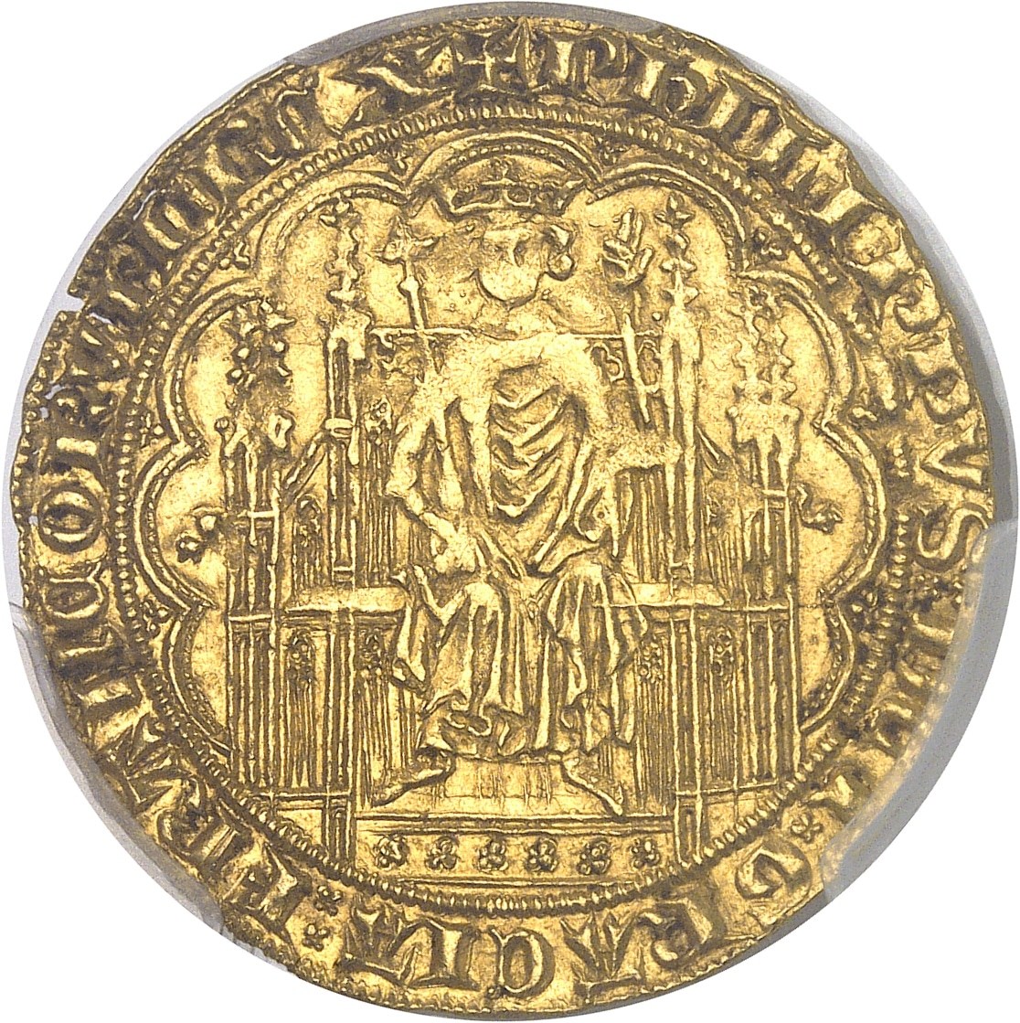 Av. + PHILIPPVS: DEI: GRACIA: FRANCORVM: REX. Le Roi assis dans une stalle gothique, couronné, tenant le sceptre et la main du justice, dans un polylobe interrompu en bas, cantonné de petits trèfles.