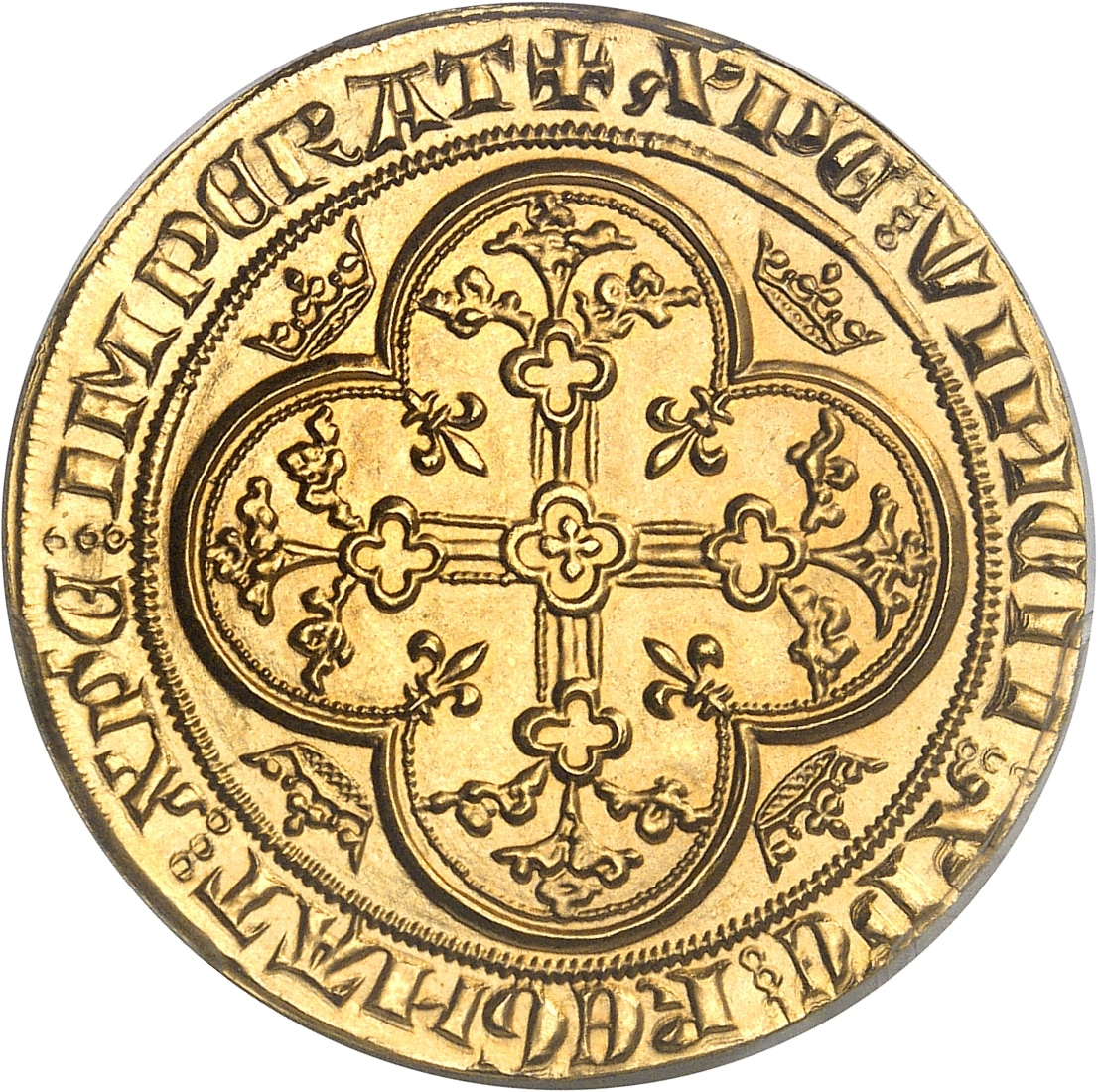 Rv. + XP'C: VINCIT: XP'C: REGNAT: XP'C: IMPERAT. Croix quadrilobée, feuillue et fleuronnée, dans un quadrilobe fleurdelisé accosté de quatre couronnelles.
