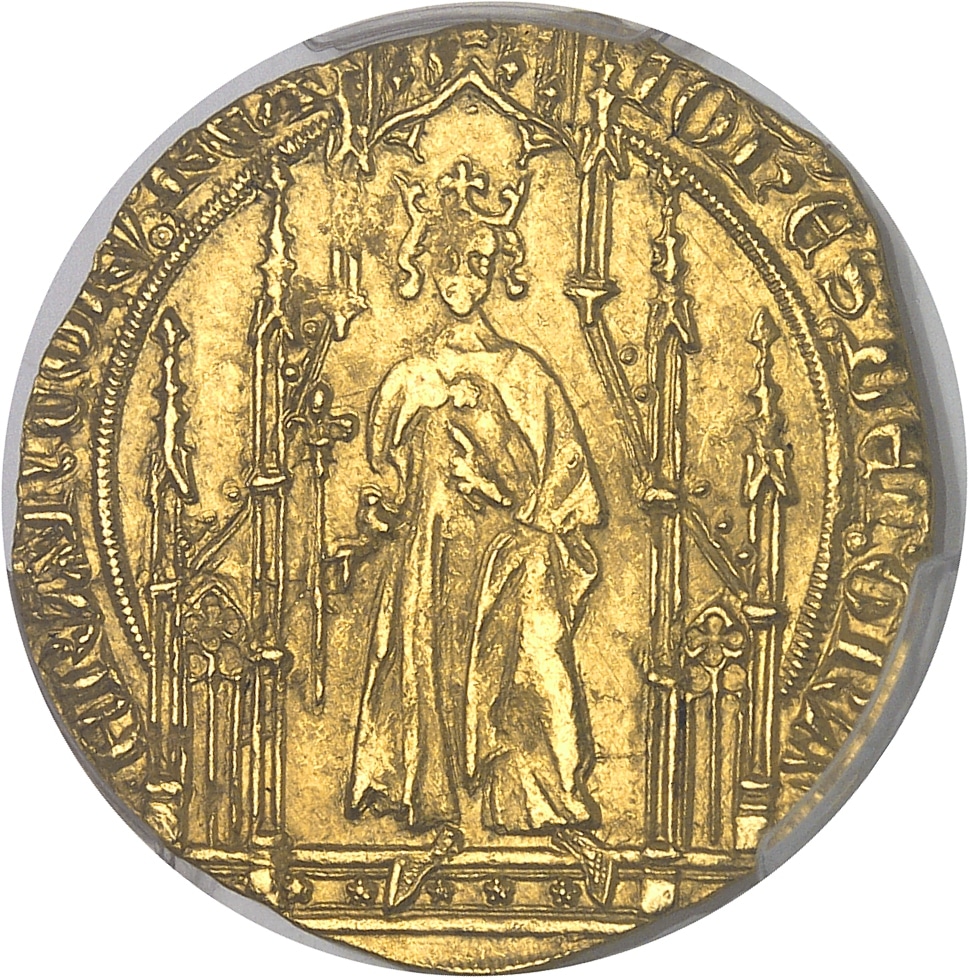 Av. IOH’ES: DEI: GRA - FRANCORV: REX. Le Roi debout sous un dais gothique, couronné, tenant le sceptre.