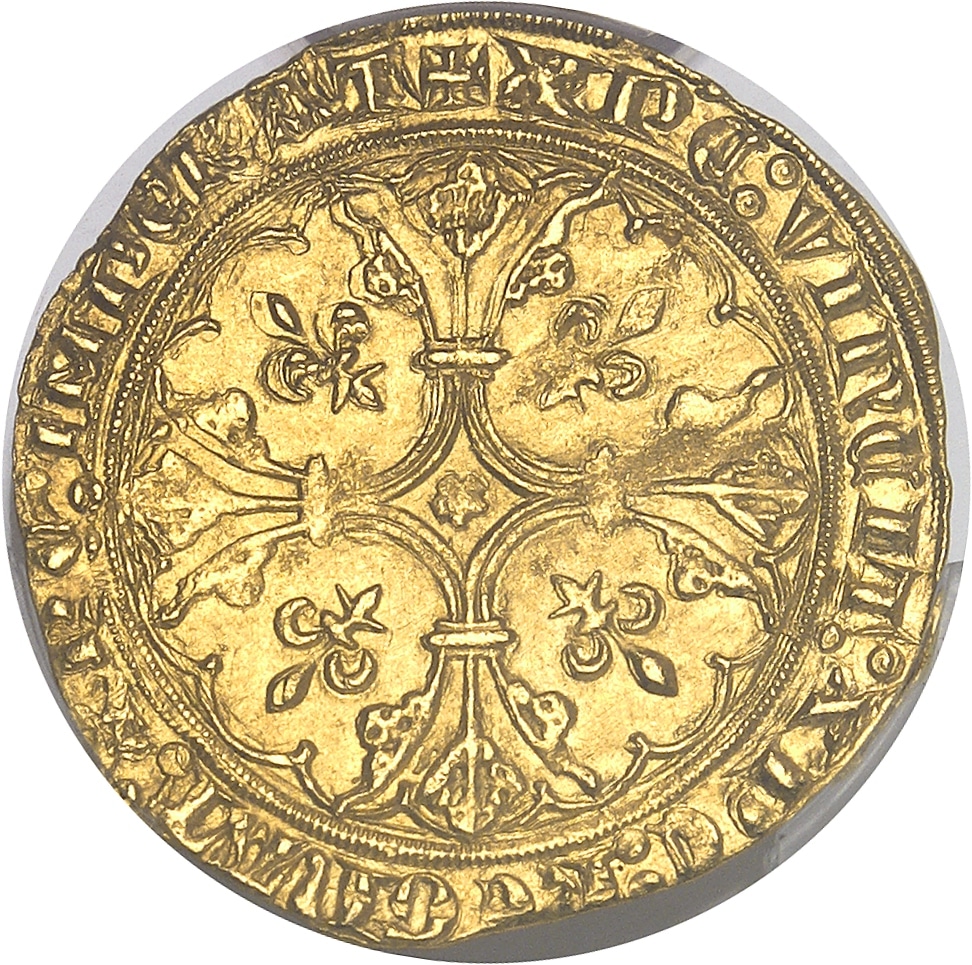 Rv. + XPC: VINCIT: XPC: REGNAT: XPC: IMPERAT. Croix fleuronnée et feuillue, incurvée en cœur (avec fleuron), accostée de quatre lis, dans un polylobe.