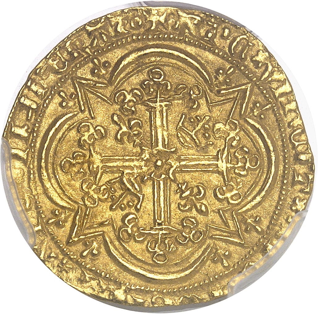 Rv. + XPC* VINCIT* XPC* REGNAT* XPC* IMPERAT. Croix tréflée avec quadrilobe anglé en cœur, cantonnée de deux lis et de deux couronnelles, dans un quadrilobe anglé accosté de lis.