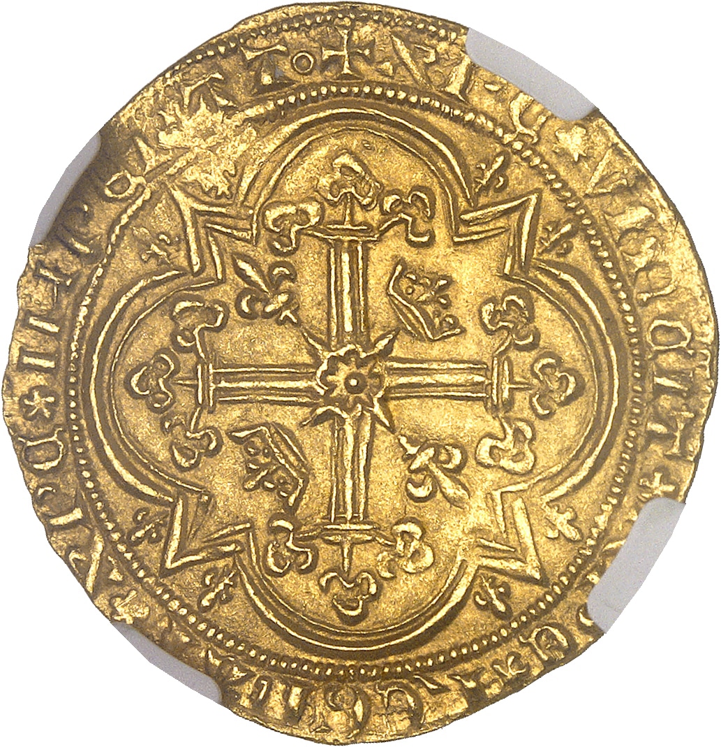 Rv. + XPC* VINCIT* XPC* REGNAT* XPC* IMPERAT°. Croix tréflée avec quadrilobe anglé en cœur, cantonnée de deux lis et de deux couronnelles, dans un quadrilobe anglé accosté de lis.