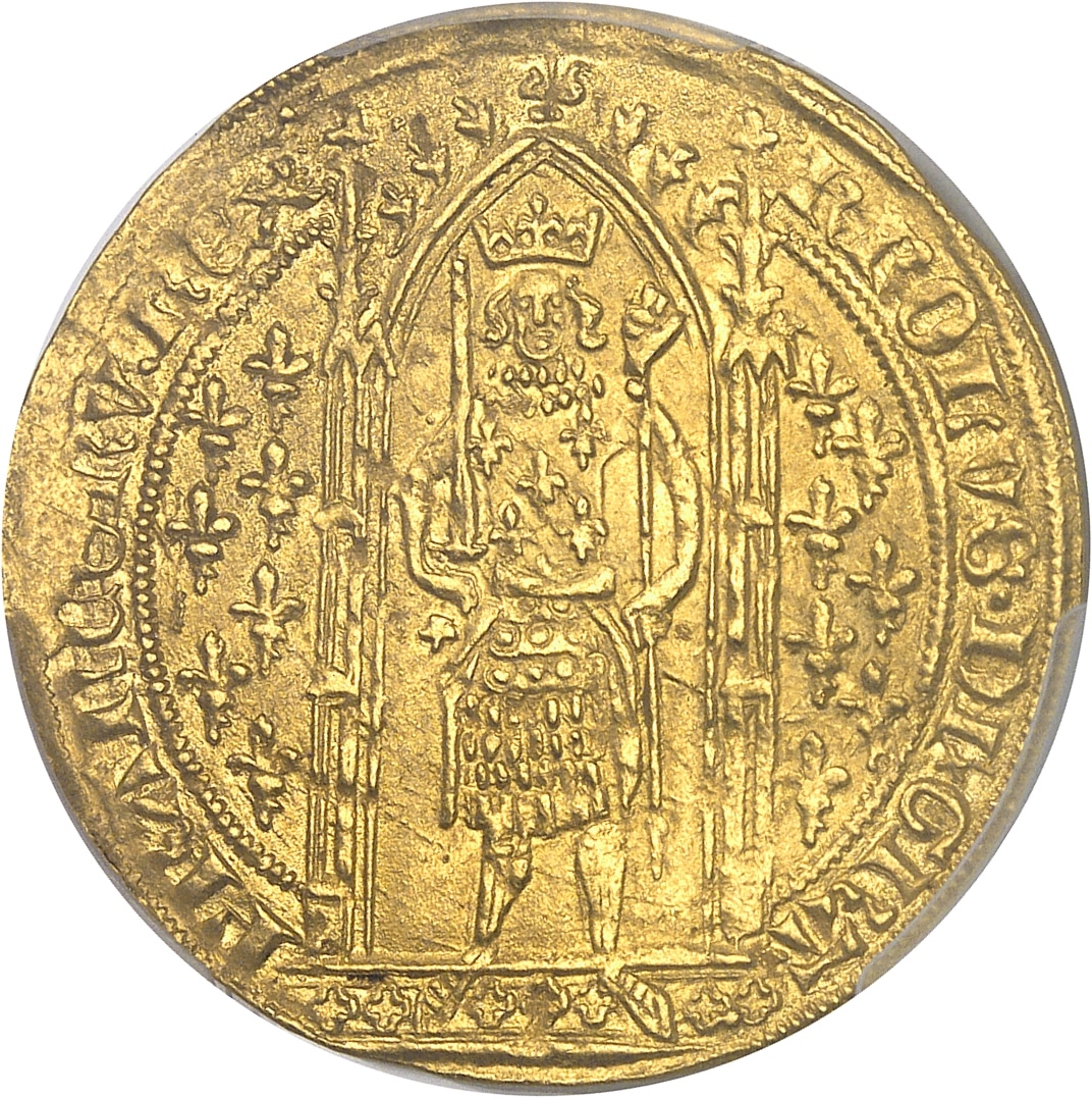 Av. KAROLVSx DIx GR - FRANCORVx REX. Le Roi, couronné, debout sous un dais accosté de lis, portant une cotte d’armes fleurdelisée par-dessus sa cotte de mailles, tenant l’épée et la main de Justice.