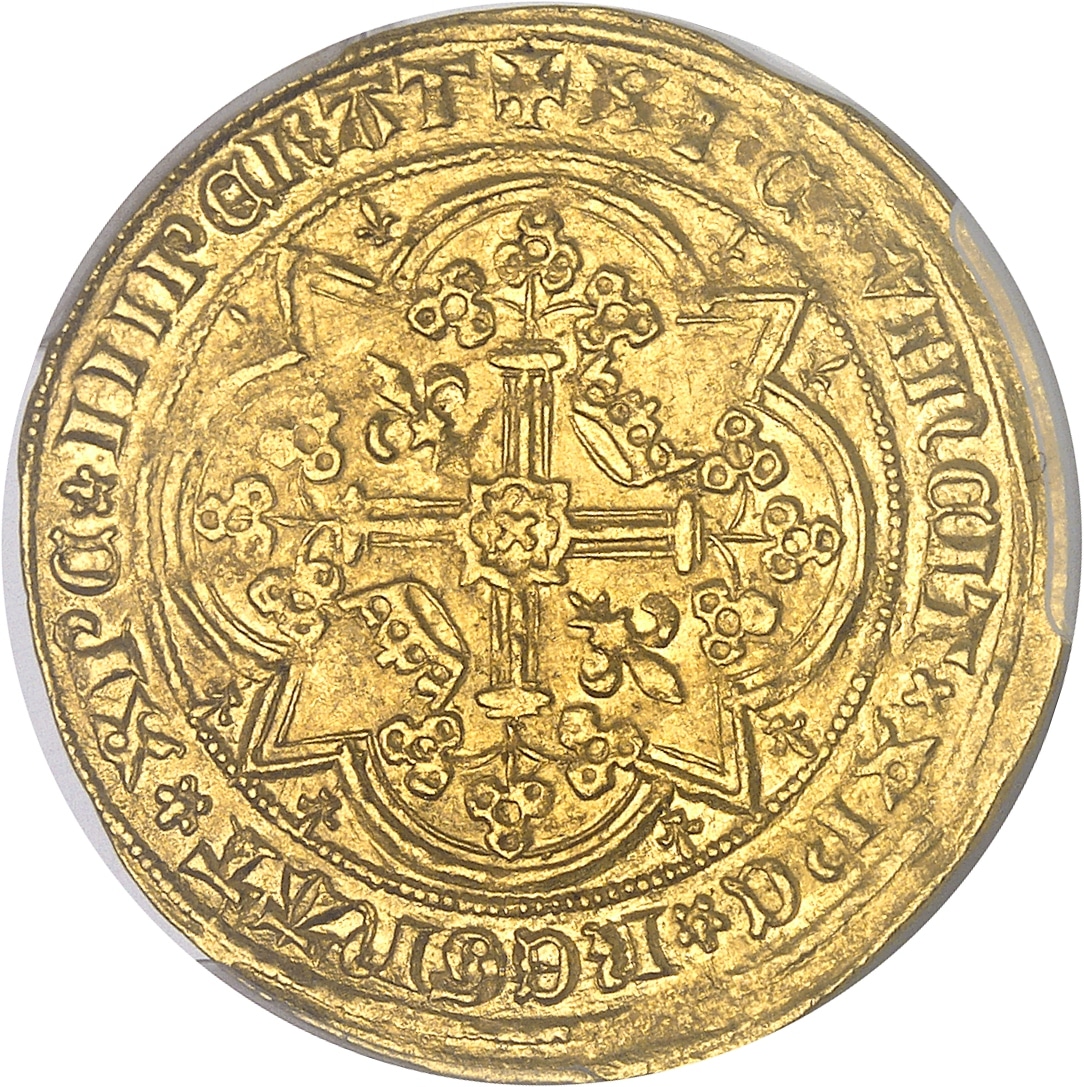 Rv. + XPC* VINCIT* XPC* REGNAT* XPC* IMPERAT. Croix tréflée avec quadrilobe anglé en cœur, cantonnée de deux lis et de deux couronnelles, dans un quadrilobe anglé accosté de lis.