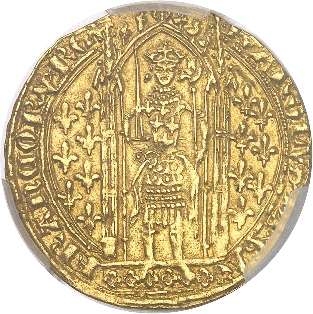 Av. KAROLVSx DIx GR - FRANCORVx REX. Le Roi, couronné, debout sous un dais accosté de lis, portant une cotte d’armes fleurdelisée par-dessus sa cotte de mailles, tenant l’épée et la main de Justice.