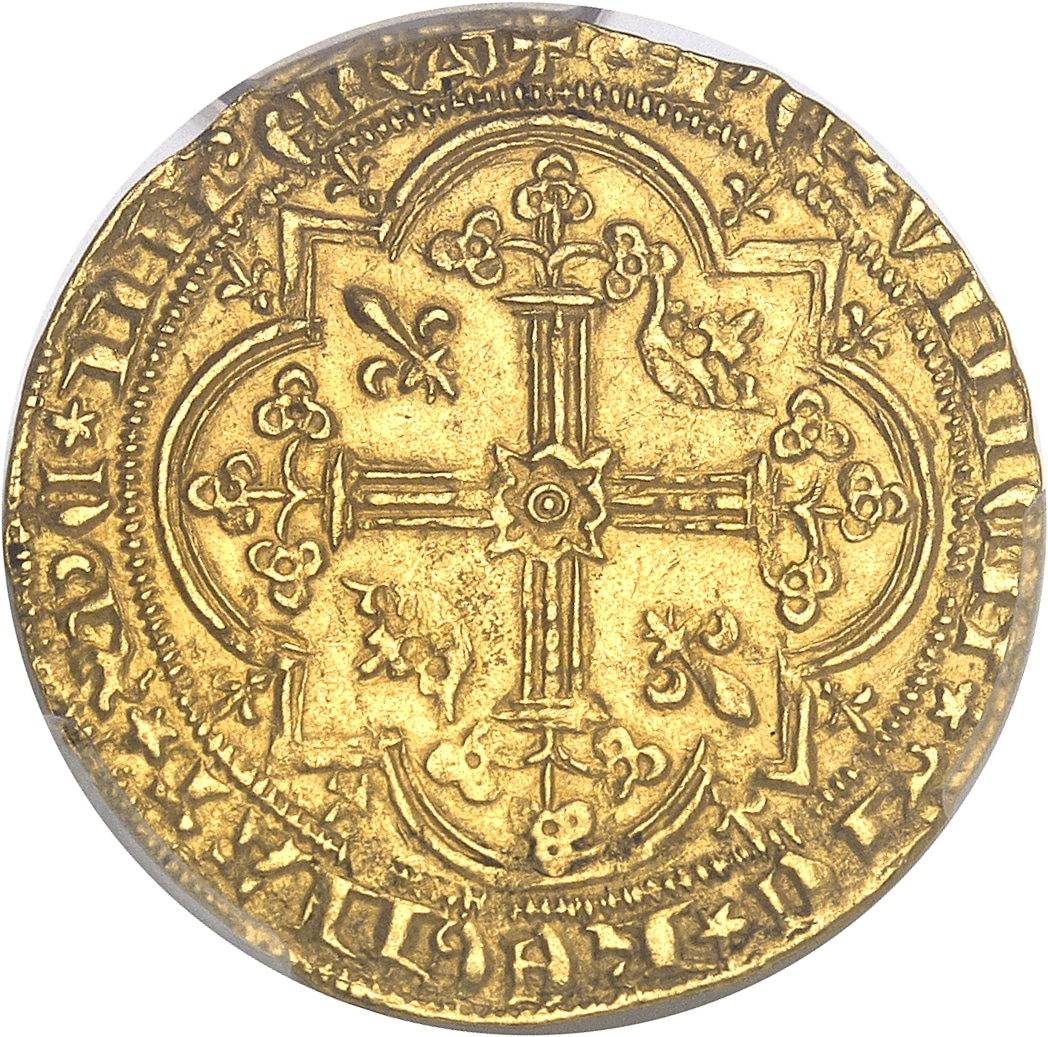 Rv. + XPC* VINCIT* XPC* REGNAT* XPC* IMPERAT. Croix tréflée avec quadrilobe anglé en cœur, cantonnée de deux lis et de deux couronnelles, dans un quadrilobe anglé accosté de lis.