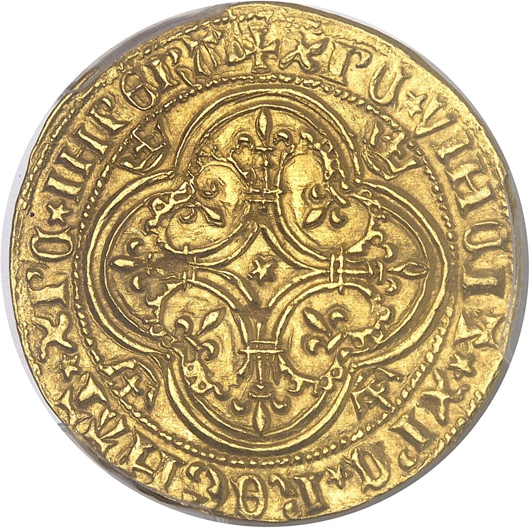 Rv. + XPC* VINCIT* XPC* REGNAT* XPC* IMPERAT. Croix fleurdelisée et feuillue, avec étoile dans un losange curviligne en cœur, le tout dans un quadrilobe cantonné de quatre couronnelles.
