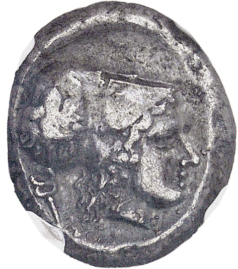 Rv. Tête d’Athéna à droite, coiffée d’un casque corinthien, derrière un caducée.