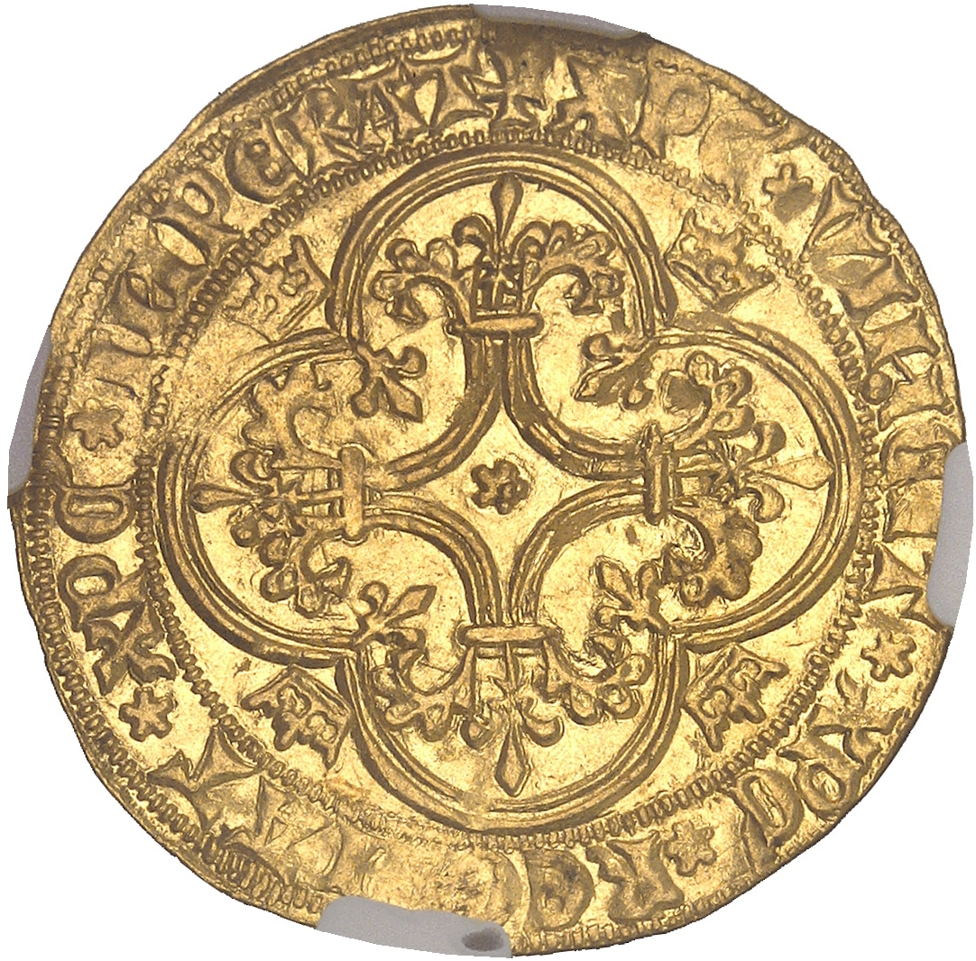 Rv. + XPC* VINCIT* XPC* REGNAT* XPC* IMPERAT. Croix fleurdelisée et feuillue, avec étoile dans un losange curviligne en cœur, le tout dans un quadrilobe cantonné de quatre couronnelles.