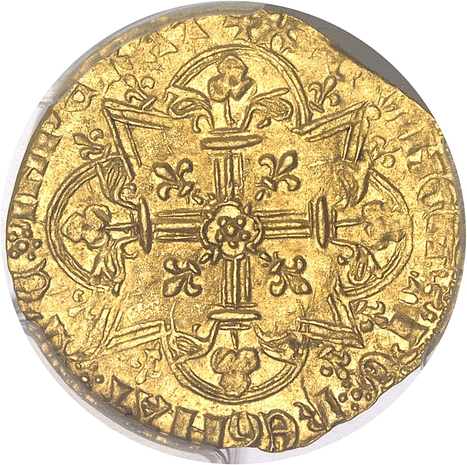 Rv. + XPC* VINCIT* XPC* REGNAT* XPC* IMPERAT. Croix tréflée et feuillue, avec rose en cœur, cantonnée de quatre lis, le tout dans un quadrilobe anglé cantonné de huit petits lis.