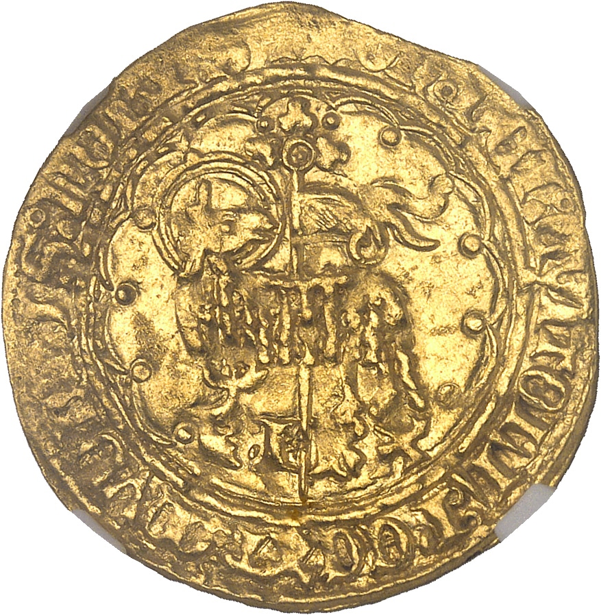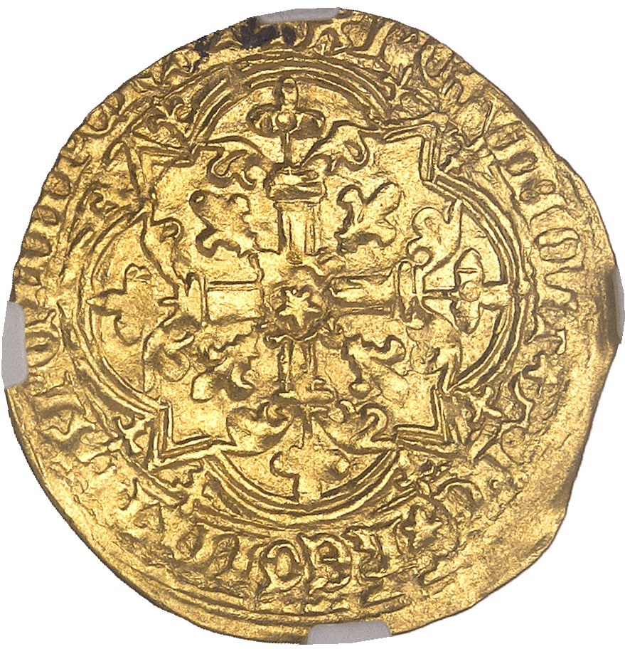 Rv. + XPC* VINCIT* XPC* REGNAT* XPC* IMPERAT. Croix tréflée et feuillue, avec rose en cœur, cantonnée de quatre lis, le tout dans un quadrilobe anglé cantonné de huit petits lis.