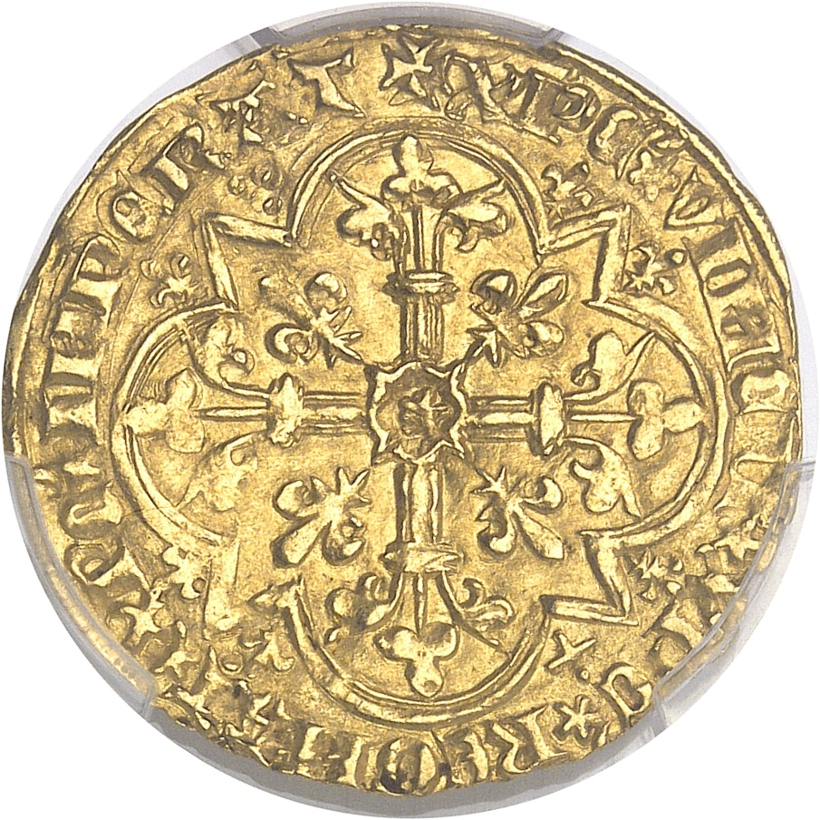 Rv. + XPC’* VINCIT* XPC’* REGNAT* XPC’* INPERAT. Croix tréflée et feuillue, avec étoile en cœur, cantonnée de quatre lis, le tout dans un quadrilobe anglé cantonné de six petits lis, d’une croisette et de trois points.