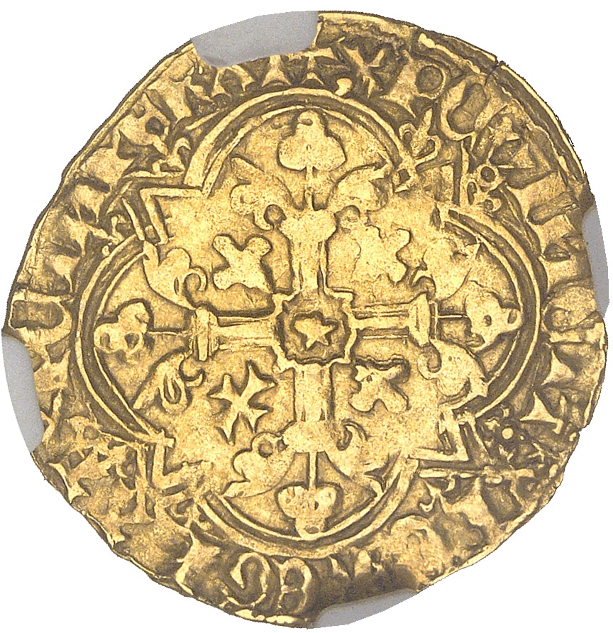 Rv. + XPC’* VINCIT* XPC’* REGNAT* XPC’* INPERAT. Croix tréflée et feuillue, avec étoile en cœur, cantonnée de trois lis et d’une croisette, le tout dans un quadrilobe anglé cantonné de huit petits lis.