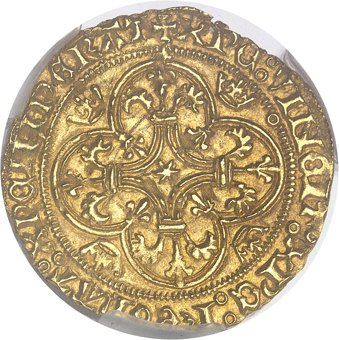 Rv. +/* XPC: VINCIT: XPC: REGNAT: XPC: IMPERAT. Croix fleurdelisée et feuillue, avec étoile dans un losange curviligne en cœur, le tout dans un quadrilobe cantonné de quatre couronnelles.