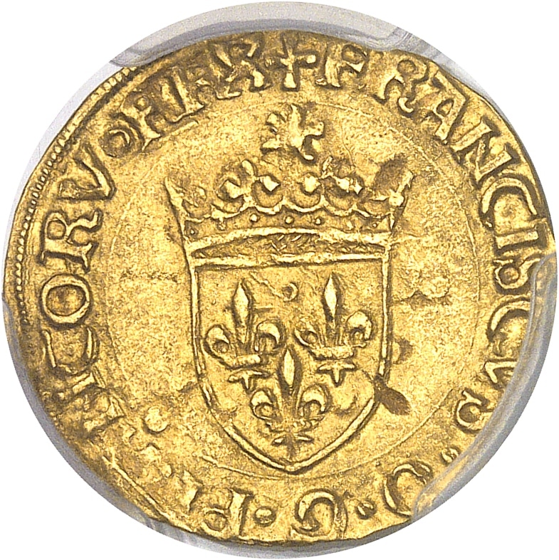 Av. + FRANCISCVS. D. G. FRANCORV (différent) REX. Écu de France couronné sous un soleil.