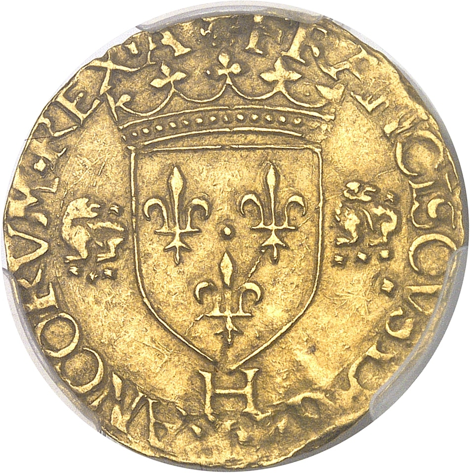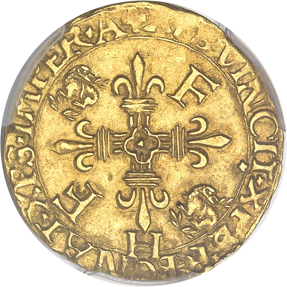 PCGS AU58 (59842849). Seuls 16.000 exemplaires fabriqués entre le 24 avril et le 17 novembre 1540 par le maître André Cybot (A final) avec une gravure de Jean Capet (petits sautoirs en ponctuation). Légère faiblesse de frappe en périphérie. Légère patine dorée. TTB à Superbe.