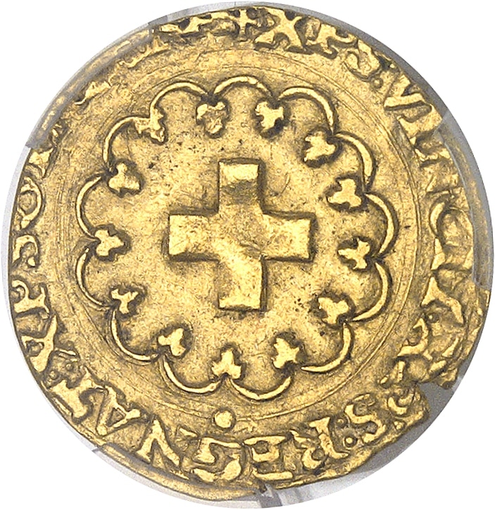 PCGS AU55 (55936890). Avec l’oliphant du maître Côme du Moustier : ce différent est inédit pour ce type ! La frappe à peine tréflée, avec un éclat de flan à 7 h. Champs légèrement frottés. Très rare. TTB.