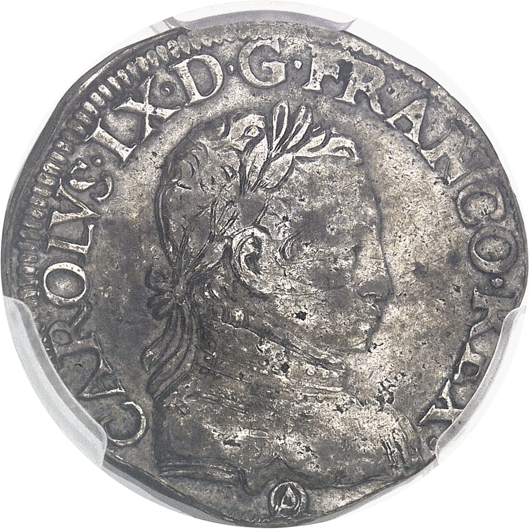 Av. CAROLVS. IX. D. G. FRANCO. REX. Buste lauré et cuirassé à droite de Charles IX, au-dessous (atelier).