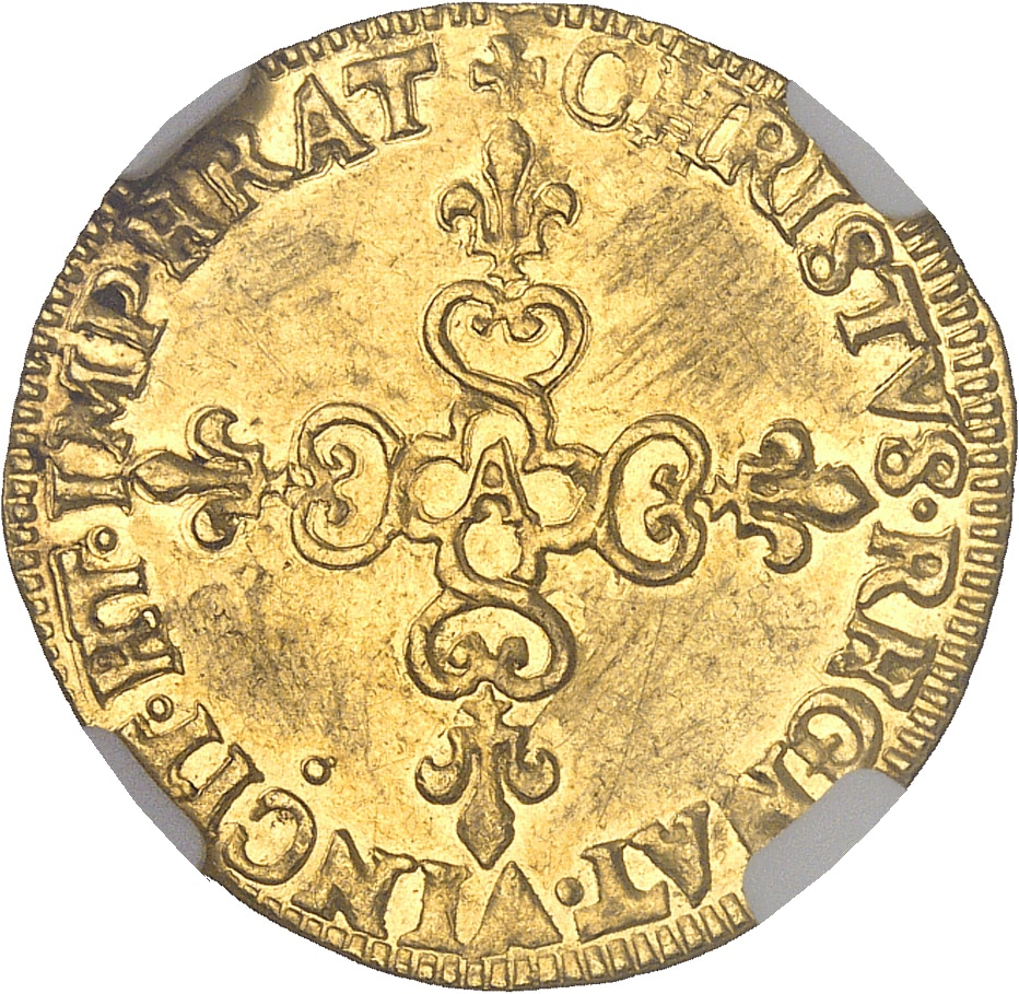 Rv. + CHRISTVS. REGNAT. VINCIT. ET. IMPERAT. Croix anillée fleurdelisée, avec (atelier) en cœur.