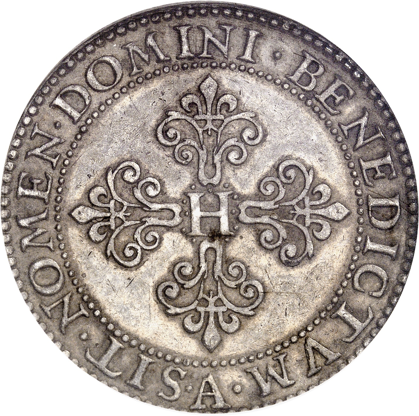 Rv. (à 6 h.) SIT. NOMEN. DOMINI. BENEDICTVM. Croix fleuronnée avec H en cœur, (atelier) à l’exergue.