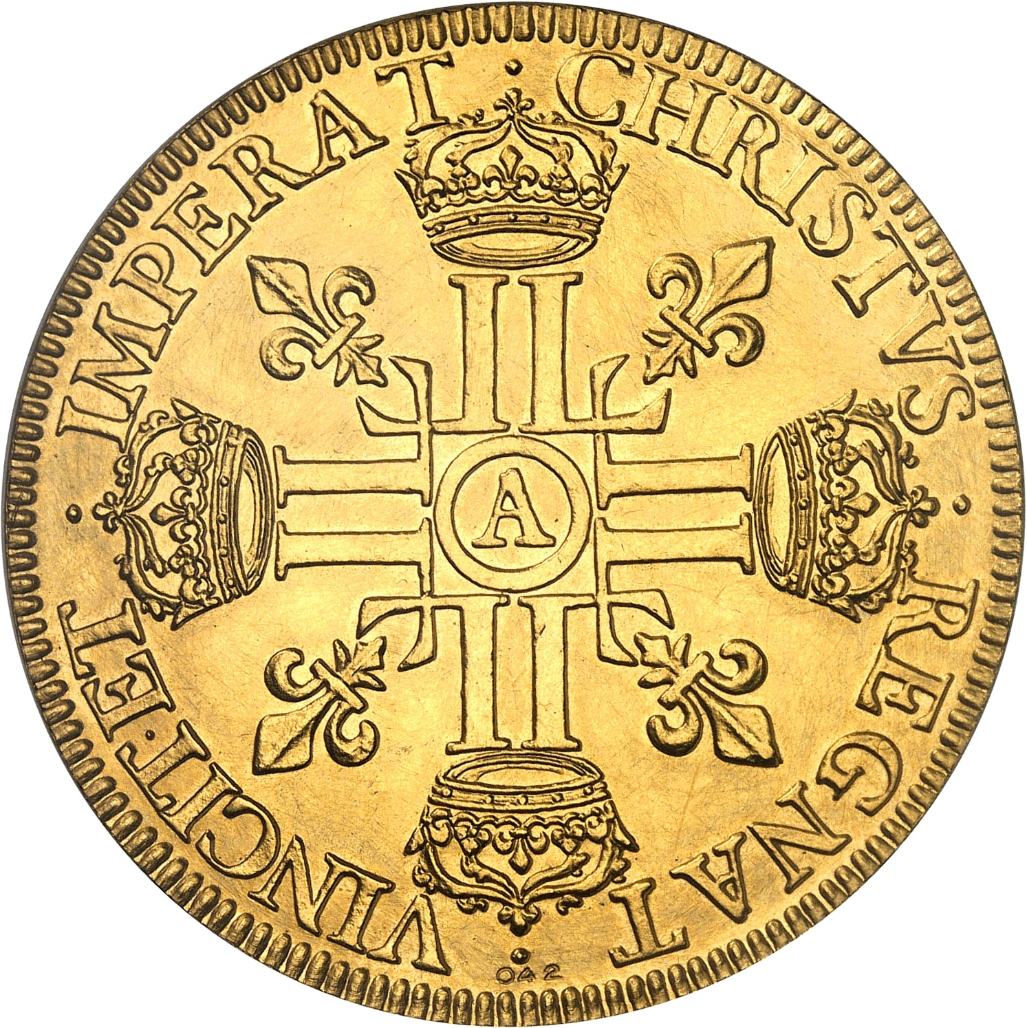 Rv. CHRISTVS. REGNAT. VINCIT. ET. IMPERAT. Croix formée de huit L, chaque bras étant couronné, avec A dans un cercle en cœur, cantonnée de quatre lis divergeant du centre ; à l’exergue (numéro).