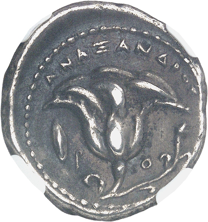 Rv. ΑΝΑΞΑΝΔΡΟΣ / P - O. Rose sur sa tige, avec un bouton à droite ; dans le champ, à gauche, bouclier celtique ovale.