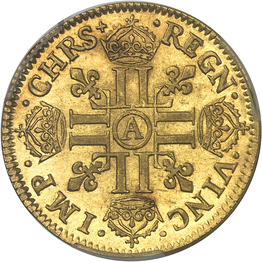 Rv. (à 9 h) .CHRS (différent) - .REGN. - .VINC. - .IMP. Croix formée de huit L, chaque bras étant couronné, avec atelier en cœur, cantonné de quatre lis divergeant du centre.