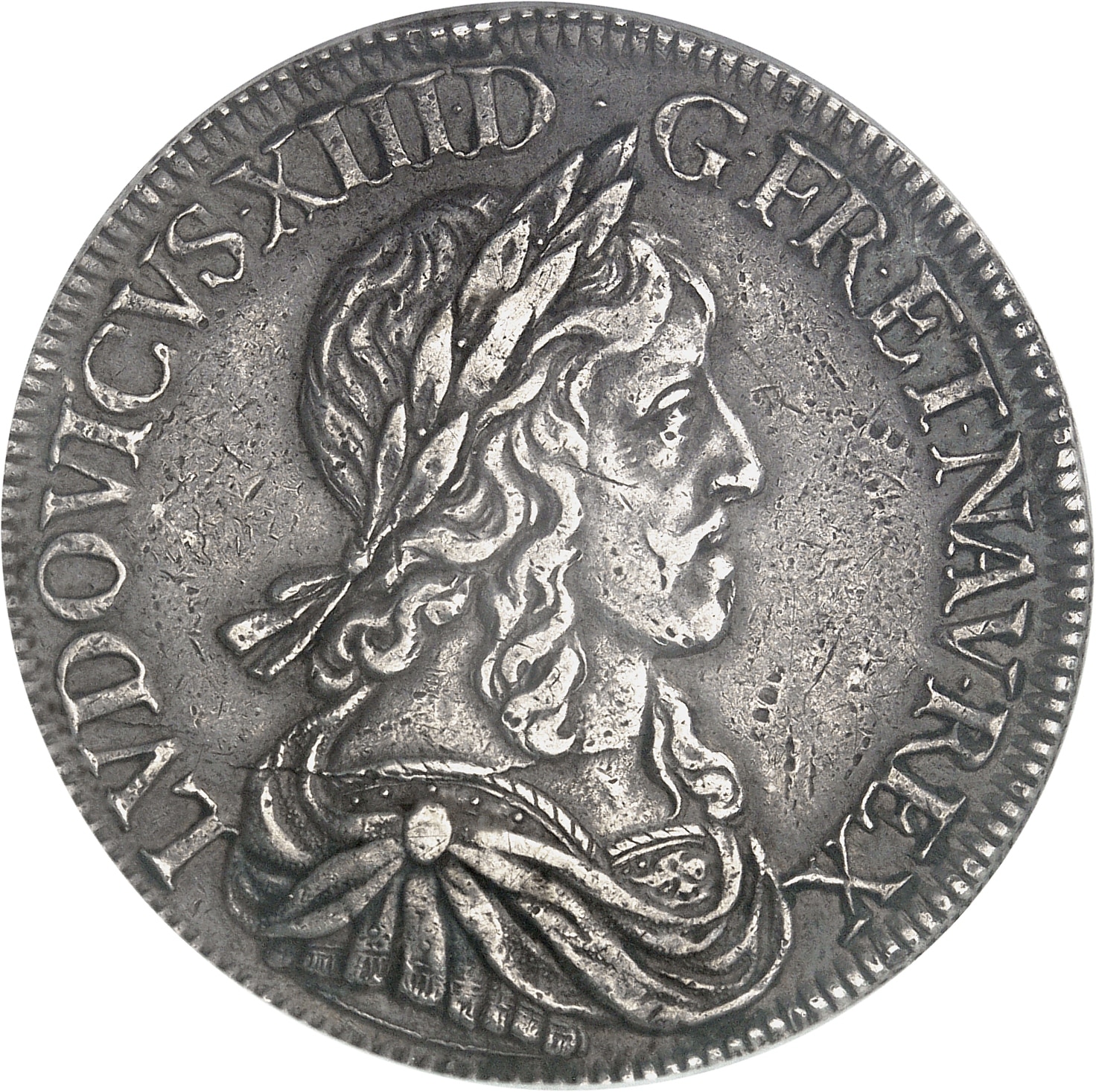 Av. LVDOVICVS. XIII. D. G. FR. ET. NAV. REX. Buste à droite du Roi, lauré, drapé et cuirassé à l’antique.