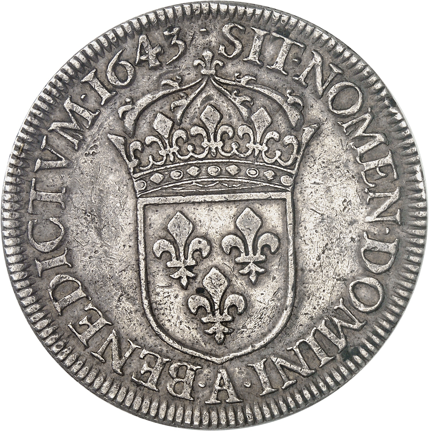 Rv. (différent) SIT. NOMEN. DOMINI. BENEDICTVM (date). Écu de France couronné ; au-dessous (atelier).