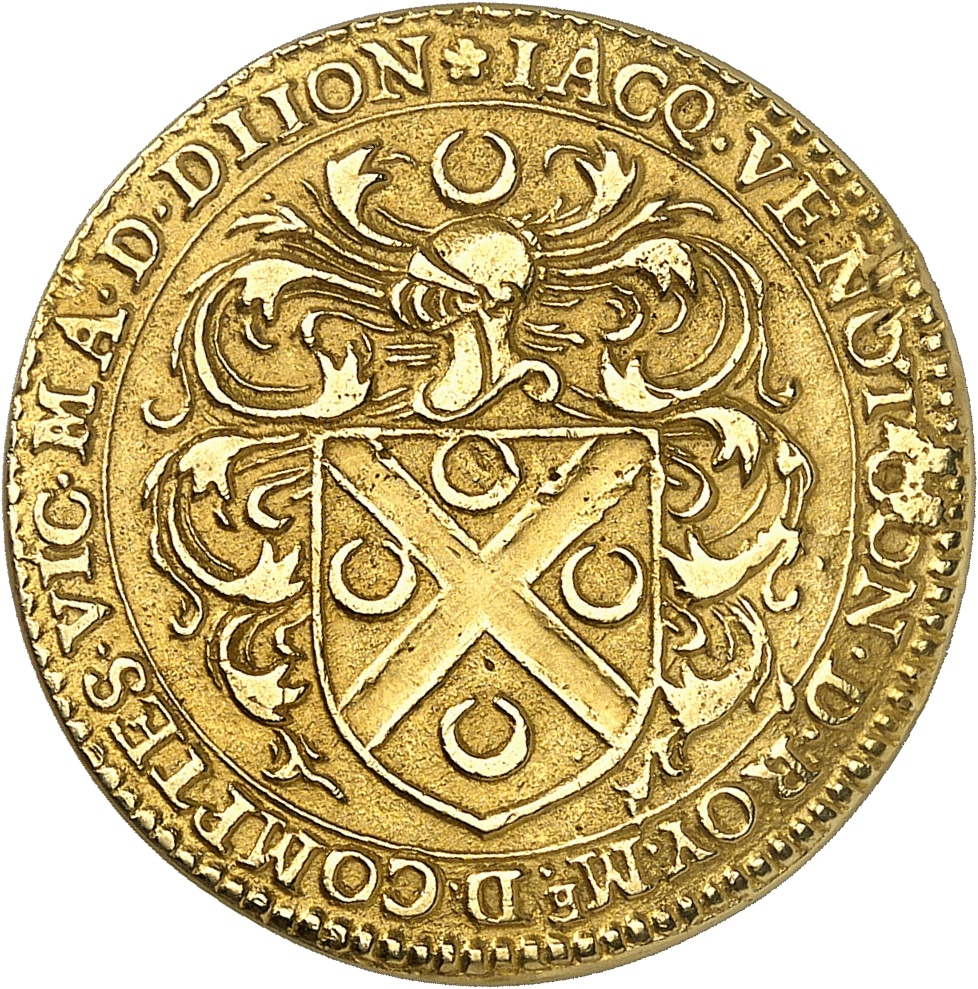 Av. * JACQ. VENOT. CON. D. ROY. ME. D. COMPTES. VIC. MA. D. DIION. Écu aux armes de Jacques Venot sous un casque taré et lambrequiné à gauche, surmonté d’un croissant.