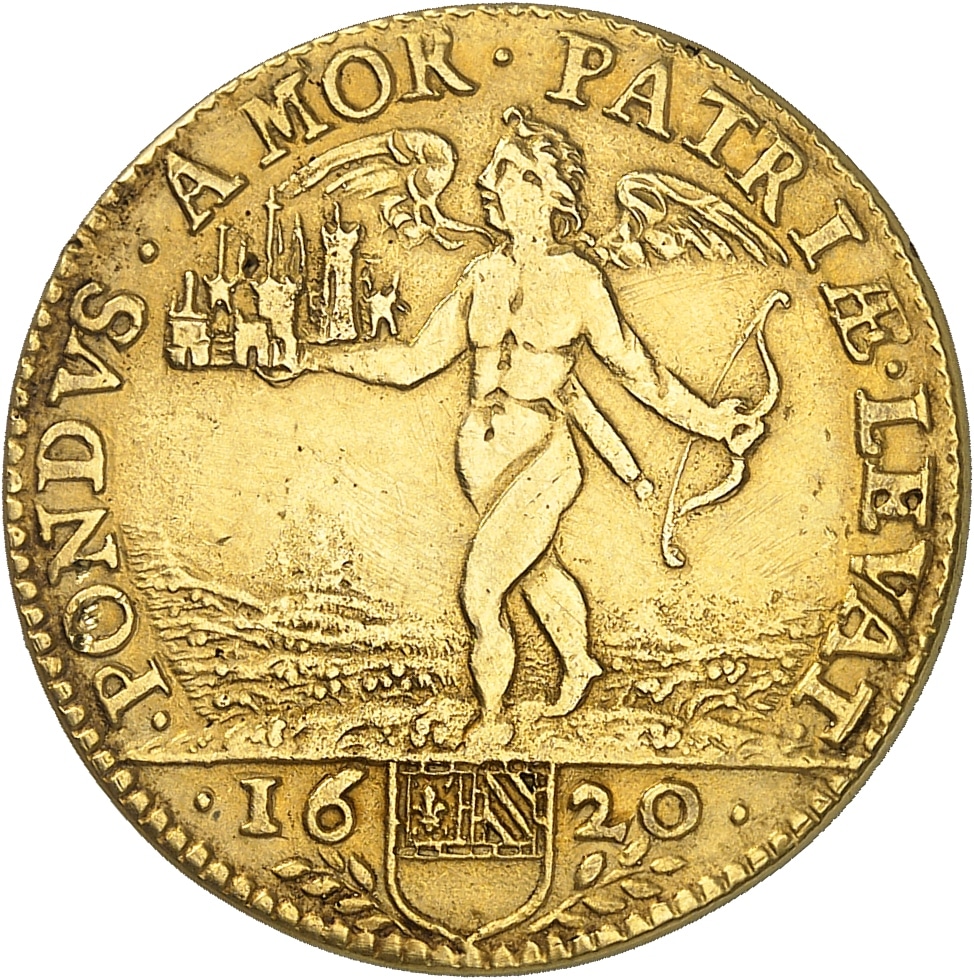Rv. PONDVS. AMOR. PATRIAE. LEVAT. L'Amour passant à gauche, tenant une ville sur sa main droite et un arc de la main gauche. À l’exergue : écu de Dijon au centre de la (date).