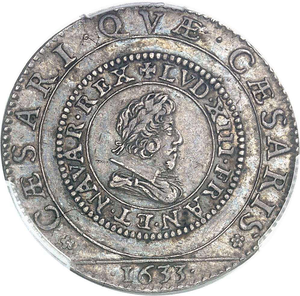 Av. *CAESARI. QVÆ. CÆSARIS* [Rendez à César ce qui est à César] en légende extérieure, et au centre représentation d’un denier tournois : + LVD. XIII. FRAN. ET. NAVAR. REX. Buste lauré, drapé et cuirassé, avec col plat, à droite (buste de Pierre Régnier) ; à l’exergue : (date).