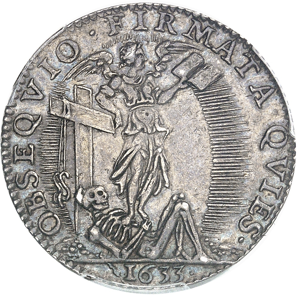 Rv. OBSEQVIO. FIRMATA. QVIES. Debout sur un squelette renversé, un ange, à droite, entouré d’une auréole, les ailes éployées, lisant dans un livre qu’il tient de la main gauche, et s’appuyant sur une croix ; à l’exergue : (date).