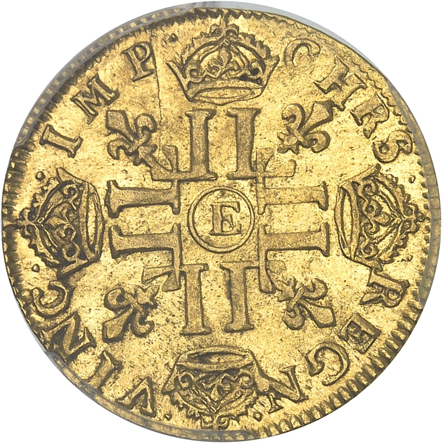 Rv. .CHRS. - .REGN. - .VINC. - .IMP. Croix formée de huit L adossées, chaque bras étant couronné, avec (atelier) dans un cercle en cœur, cantonnée de quatre lis divergeant du centre.