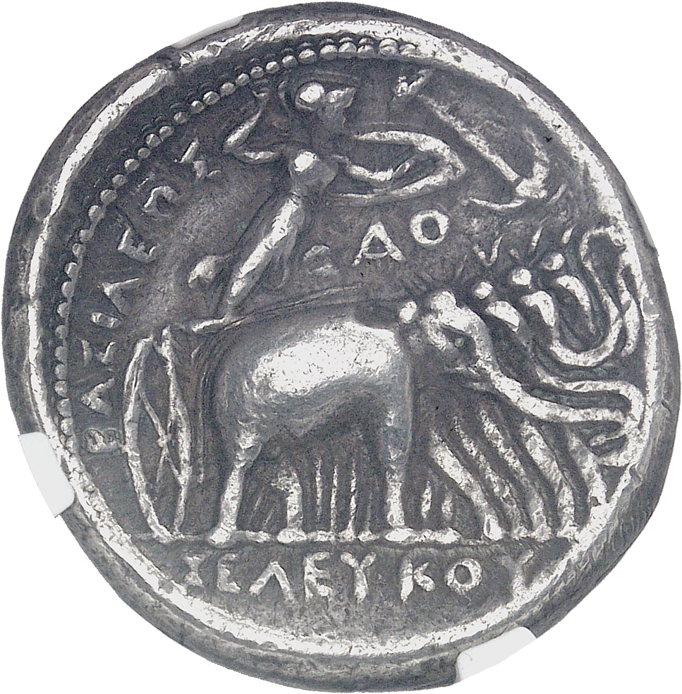 Rv. ΒΑΣΙΛΕΩΣ / ΣΕΛΕΥΚΟΥ à l’exergue. Athena Promachos, armée d’une lance et d’un bouclier, debout dans un quadrige de quatre éléphants à droite ; une ancre au-dessus et (lettres).