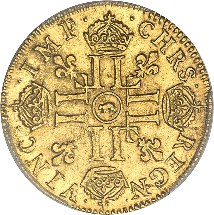 Rv. .CHRS. - .REGN. - .VINC. - .IMP. Croix formée de huit L adossées, chaque bras étant couronné, avec (atelier) dans un cercle en cœur, cantonnée de quatre lis divergeant du centre.