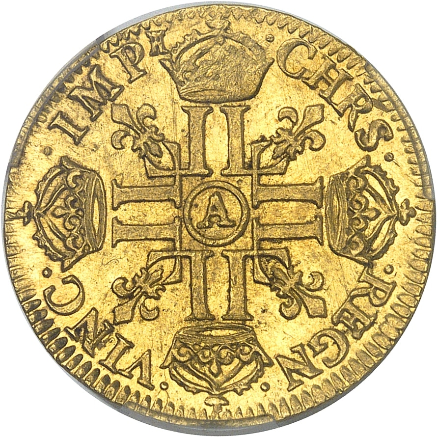 Rv. .CHRS. - .REGN. - .VINC. - .IMP (différent). Croix formée de huit L adossées, chaque bras étant couronné, avec (atelier) en cœur, cantonnée de quatre lis divergeant du centre.