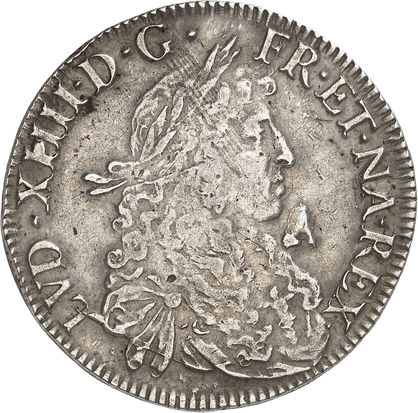 Av. LVD. XIIII. D. G. - FR. ET. NA. REX. Buste juvénile du Roi à droite, les cheveux longs, lauré, drapé et cuirassé à l’antique.