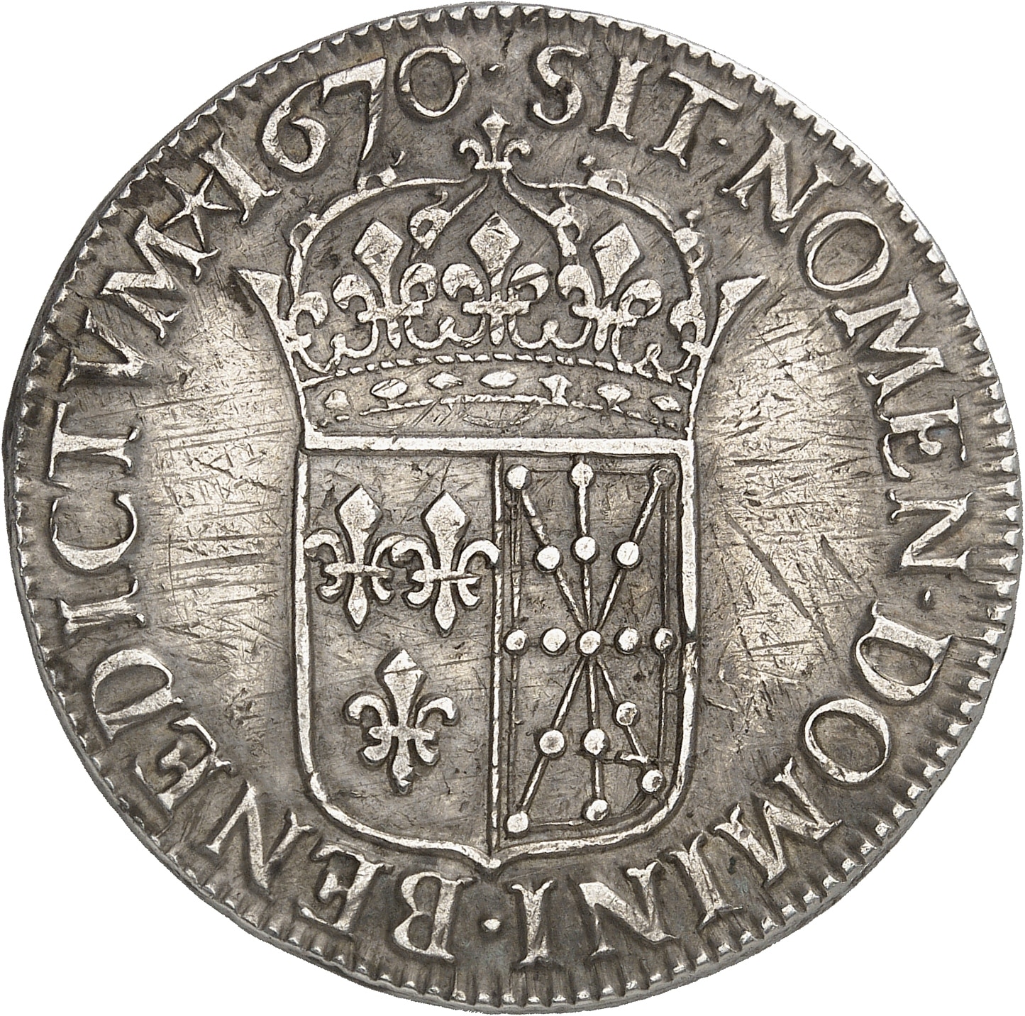 Rv. SIT. NOMEN. DOMINI. BENEDICTVM (différent) (date). Écu couronné, parti de France-Navarre.