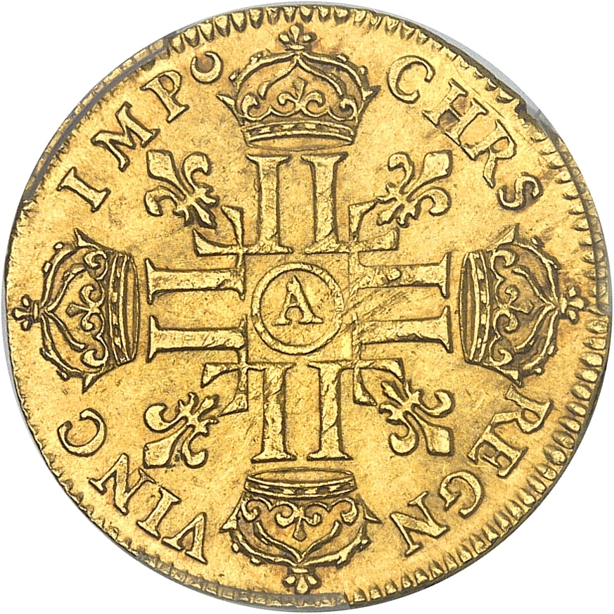 Rv. CHRS - REGN - VINC - IMP (différent). Croix formée de huit L adossées, chaque bras étant couronné, avec (atelier) dans un cercle en cœur, cantonnée de quatre lis divergeant du centre.