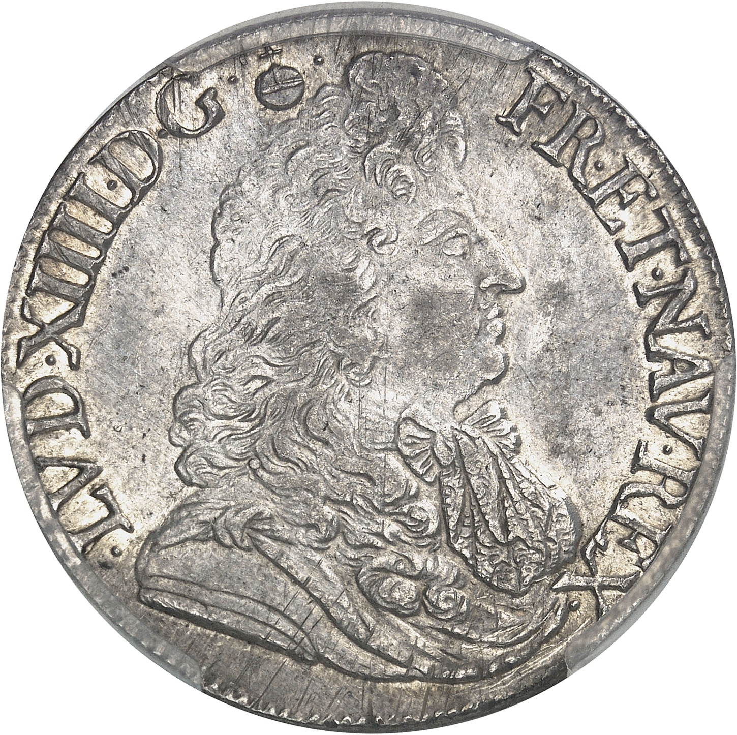 PCGS Genuine Cleaned-AU Detail (59842945). Cet exemplaire a peu circulé et conserve de son brillant d’origine sous une patine grise. On note une minime tache grattée devant le nez et un léger brossage des champs. De flan large et spectaculaire buste de Louis XIV. Rare. Superbe.