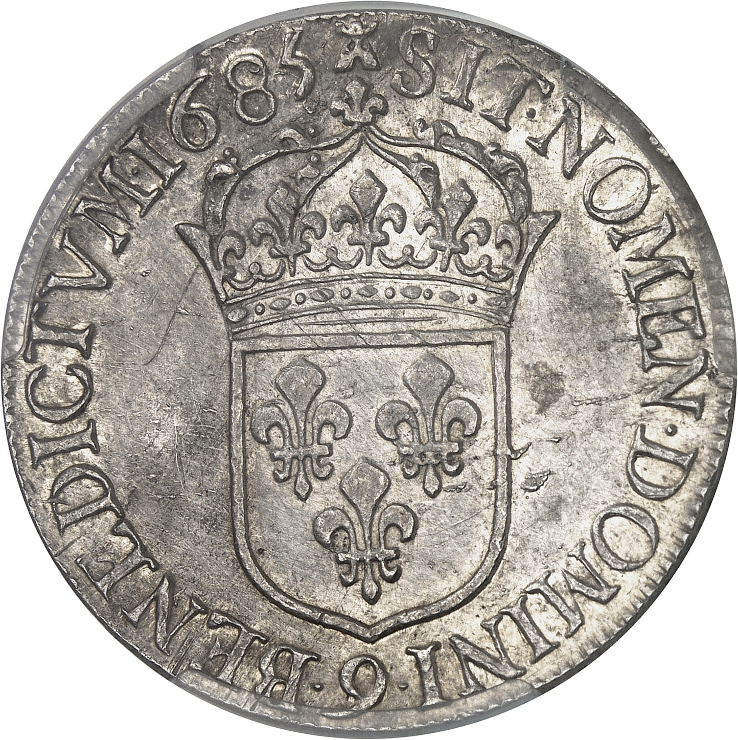 Rv. (différent) SIT. NOMEN. DOMINI. BENEDICTVM. (date). Écu de France, au-dessous (atelier).