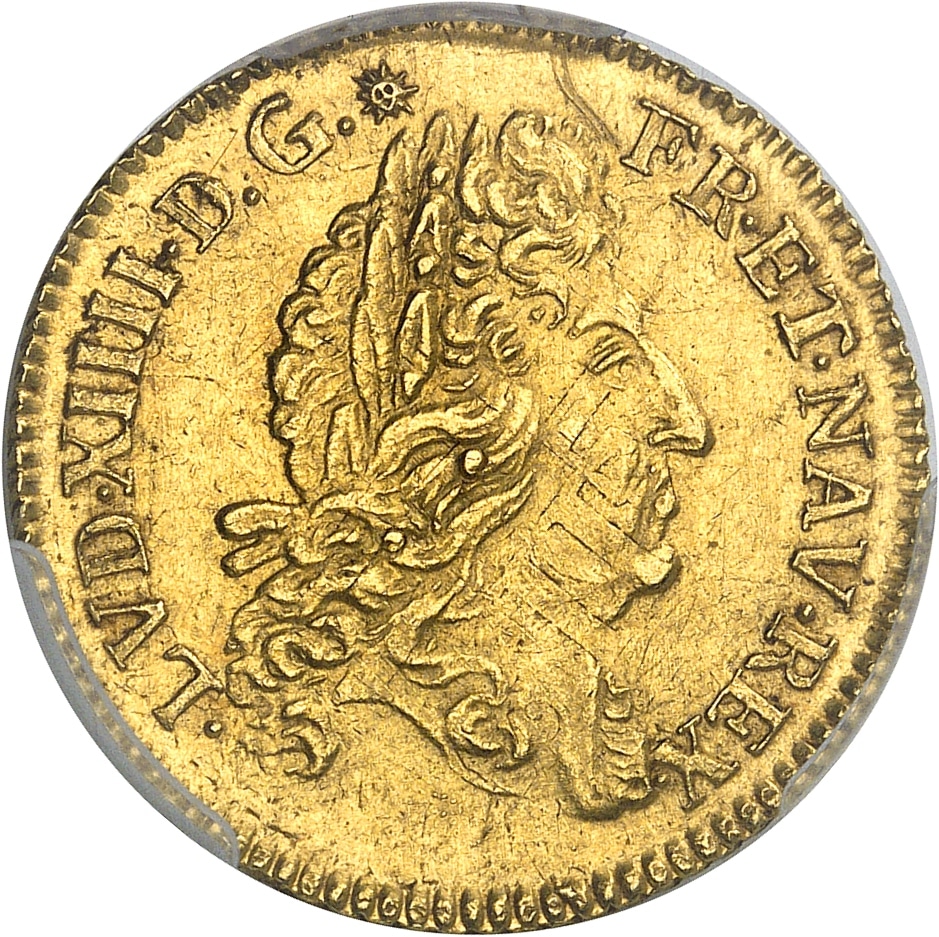 Av. LVD. XIIII. D. G. (soleil) - FR. ET. NAV. REX. Tête âgée du Roi à droite, avec une perruque laurée.