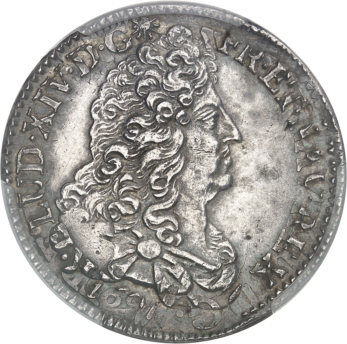 Av. LUD. XIV. D. G (différent) FR ET NAV REX. Buste à droite du Roi, drapé à l’antique ; au-dessous (date).